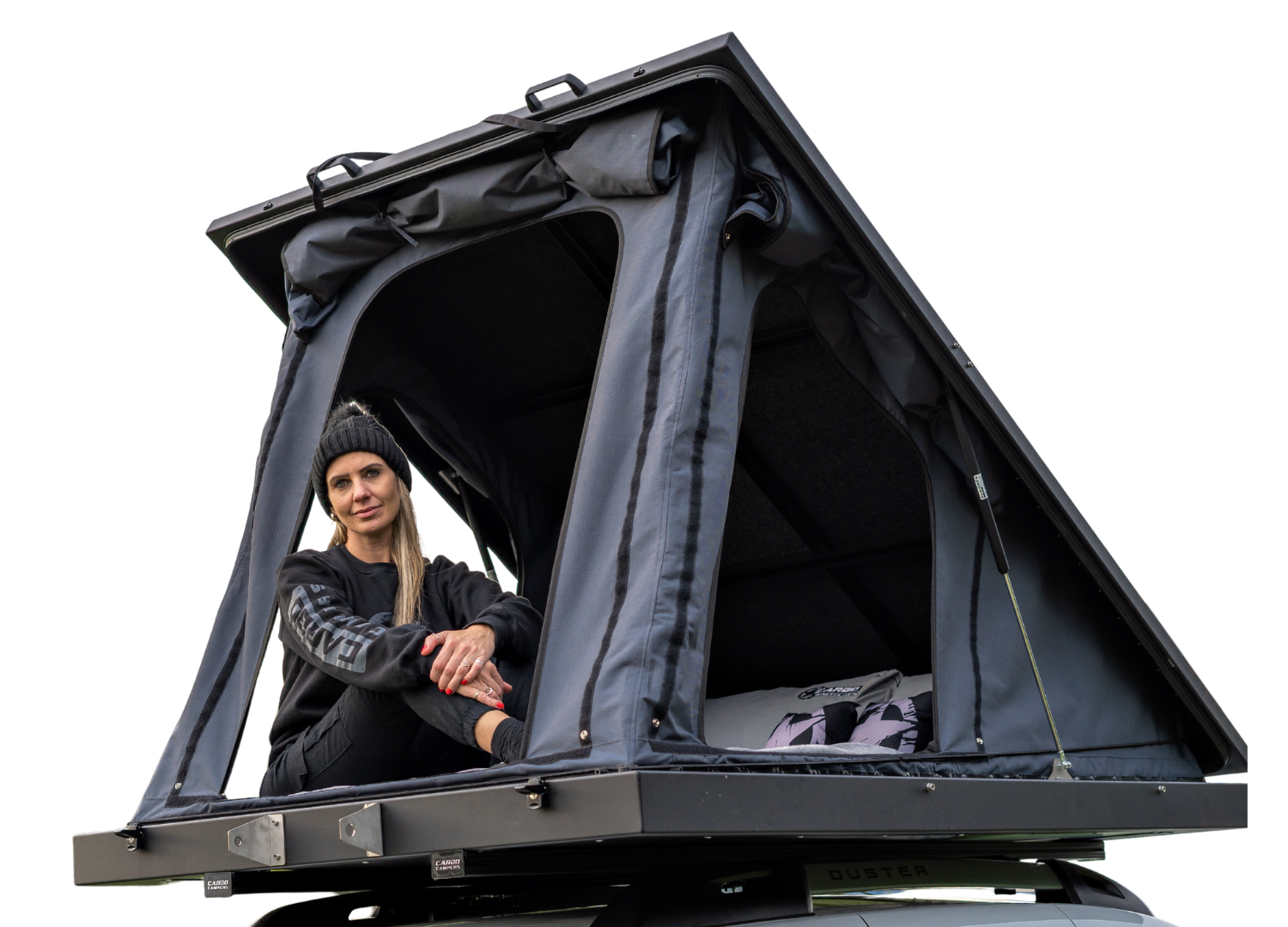 A estrutura rígida, escada desmontável, e design compacto reduzem o impacto na aerodinâmica do carro. A barraca possui três janelas com tecido impermeável duplo e mosquiteiras, oferecendo versatilidade e proteção.